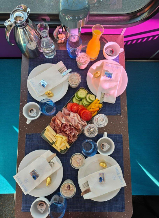 Du kannst zwischen einer Fleisch-Variante oder einer vegetarischen Alternative wählen. Während der Fahrt werden die Frühstücksplatten, frisches Brot und Orangensaft laufend nachgefüllt.