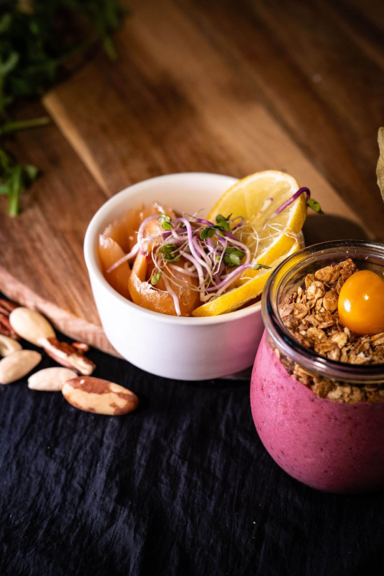- 1 Smoothie Bowl (Joghurt mit gefrorenen Beeren, Granola, Chiasamen, Kokosflocken und Früchten) pro Person