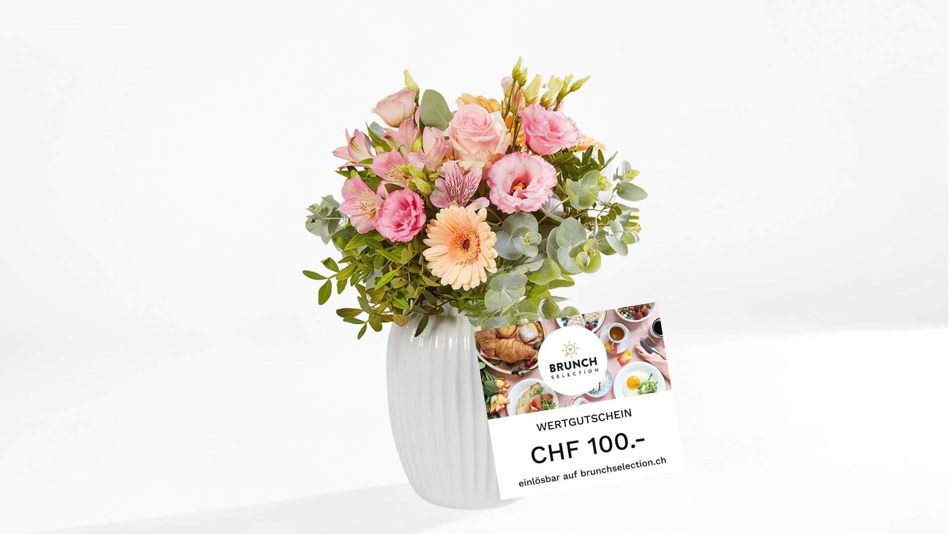 - CHF 100 Wertgutschein von BrunchSelection: Passend zum Strauss wird ein Wertgutschein von BrunchSelection mitgeliefert. Dieser Wertgutschein kann für über 350 verschiedene Angebote von mehr als 160 Anbieter schweizweit bei BrunchSelection.ch online eingelöst werden