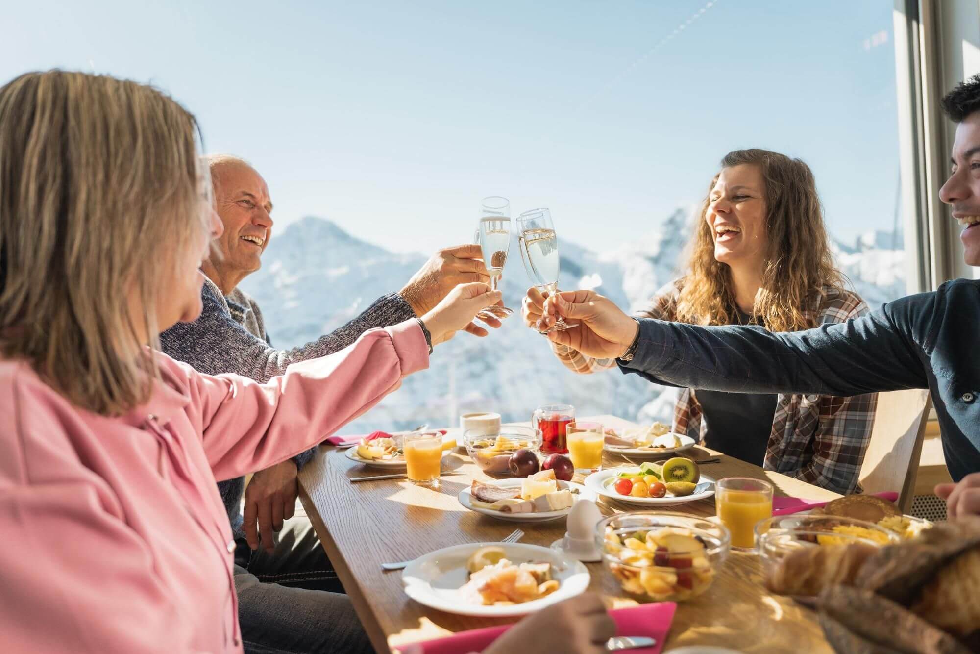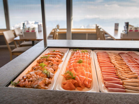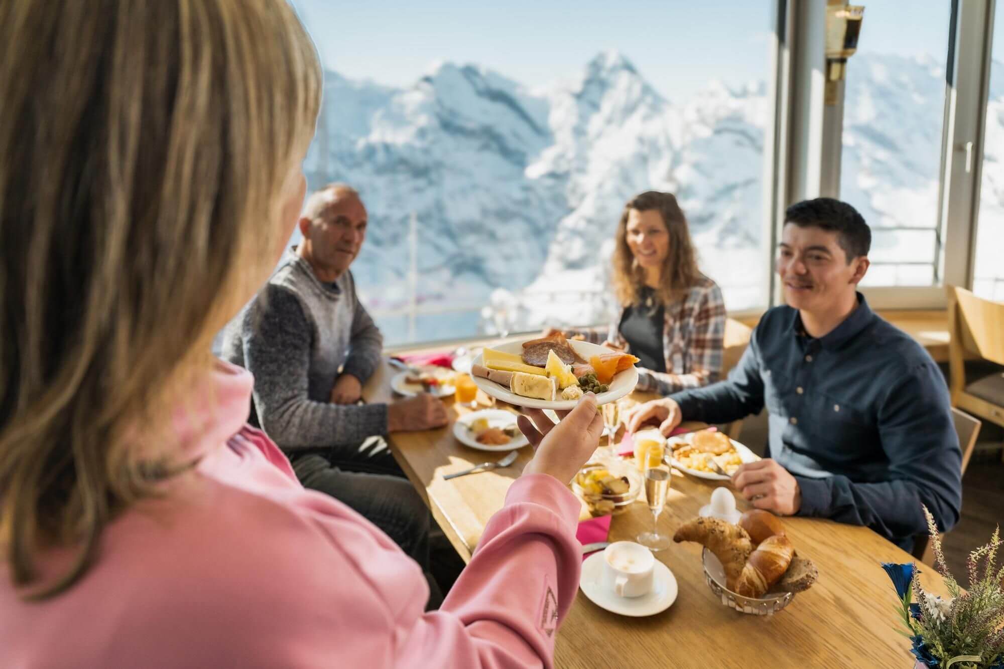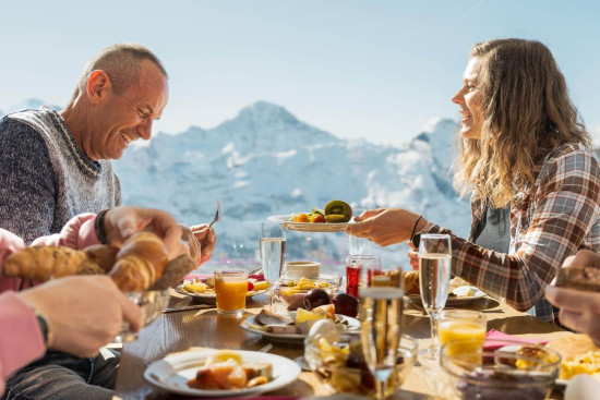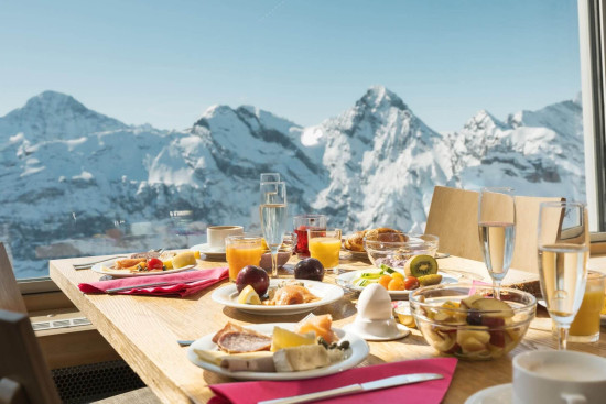 Das Schilthorn – Piz Gloria auf 2970 m ü. M. ist der Schweizer Aussichtsgipfel schlechthin. Bereits bei der Anfahrt trifft man auf ein ganz besonderes Highlight: Zwischen Stechelberg und Mürren fährt mit einer Steigung von 159,4% die steilste Seilbahn der Welt! Oben angekommen wartet das kulinarische Gipfelhighlight im 360°-Restaurant Piz Gloria: Der Schilthorn-Brunch. Der beliebte Klassiker lässt keine Wünsche offen und bietet viele Köstlichkeiten, regionale Produkten und das alles vor grandioser Bergkulisse mit Eiger, Mönch und Jungfrau. Das Angebot à discrétion findet man hier. Täglich bis 14 Uhr.